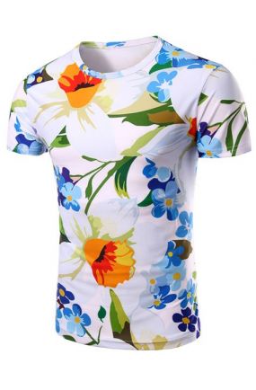 圆领花卉3D打印图案短袖男士T恤